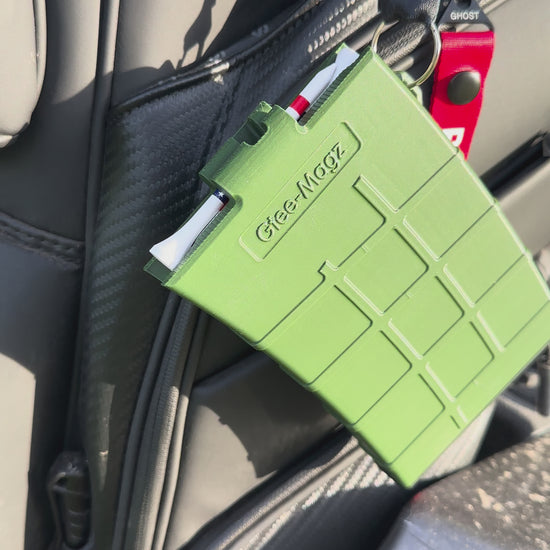 GTee-Magz is a automatic golf tee dispenser designed to attach securely to a golf bag for quick, one-handed tee access. The dispenser holds up to 10 standard golf tees and releases one tee at a time to support faster play. Compatible with 2.75-inch and 3.25-inch tees. Durable, lightweight construction with a magazine-style design. Ideal for casual rounds, tournaments, and golf gifts.